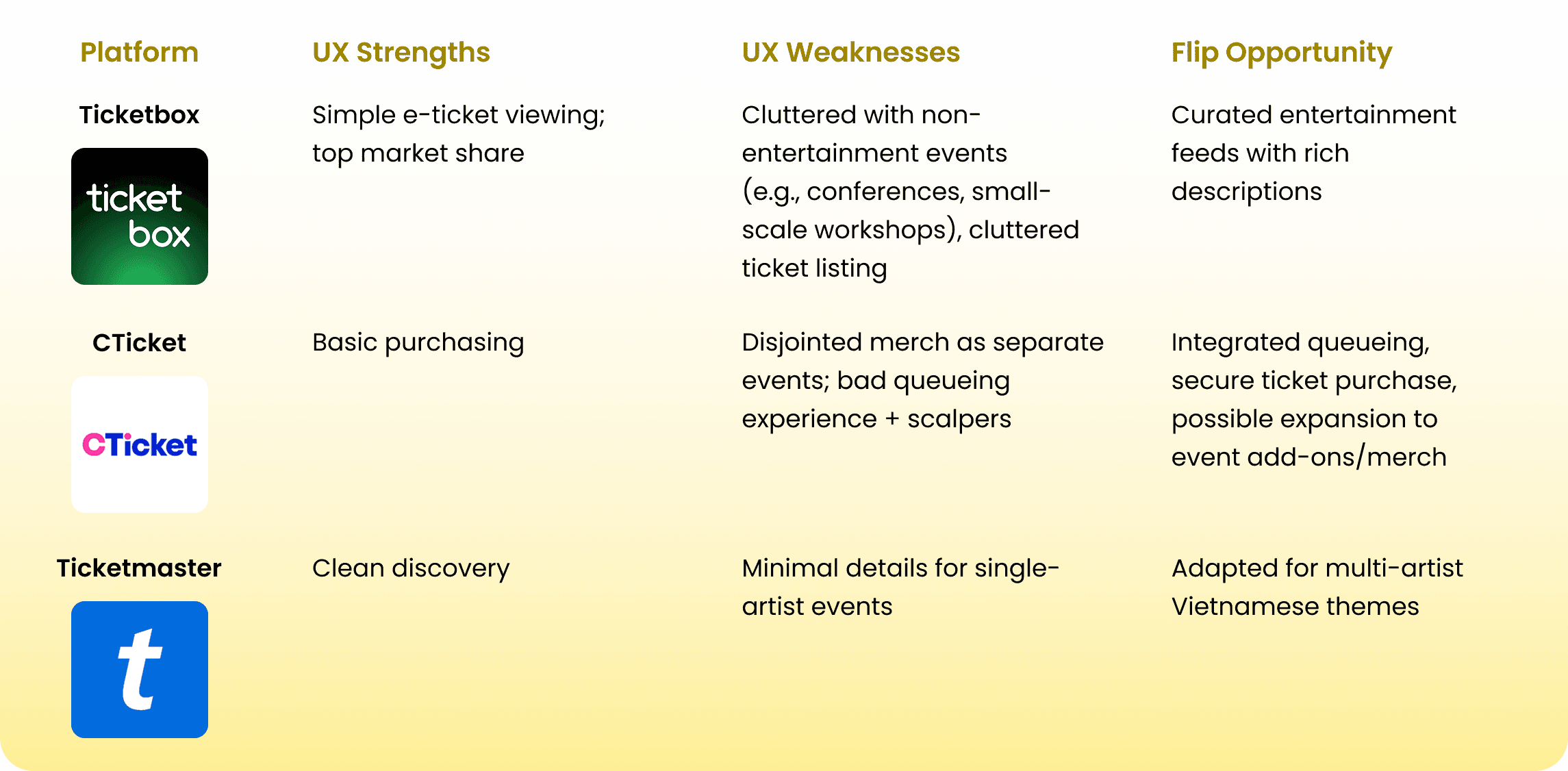 To understand users’ frustrations with ticket handling and check-in processes, I conducted 3 user interviews and analyzed 2 major Vietnamese platforms (Ticketbox and Cticket), alongside US counterparts like Ticketmaster, Seatgeek, and Luma.